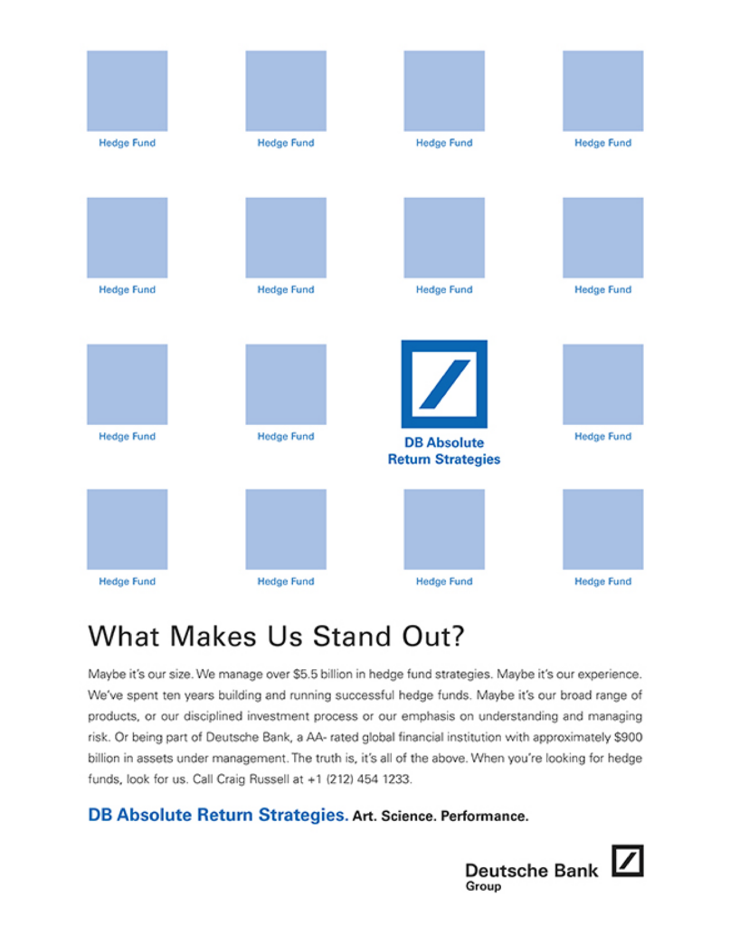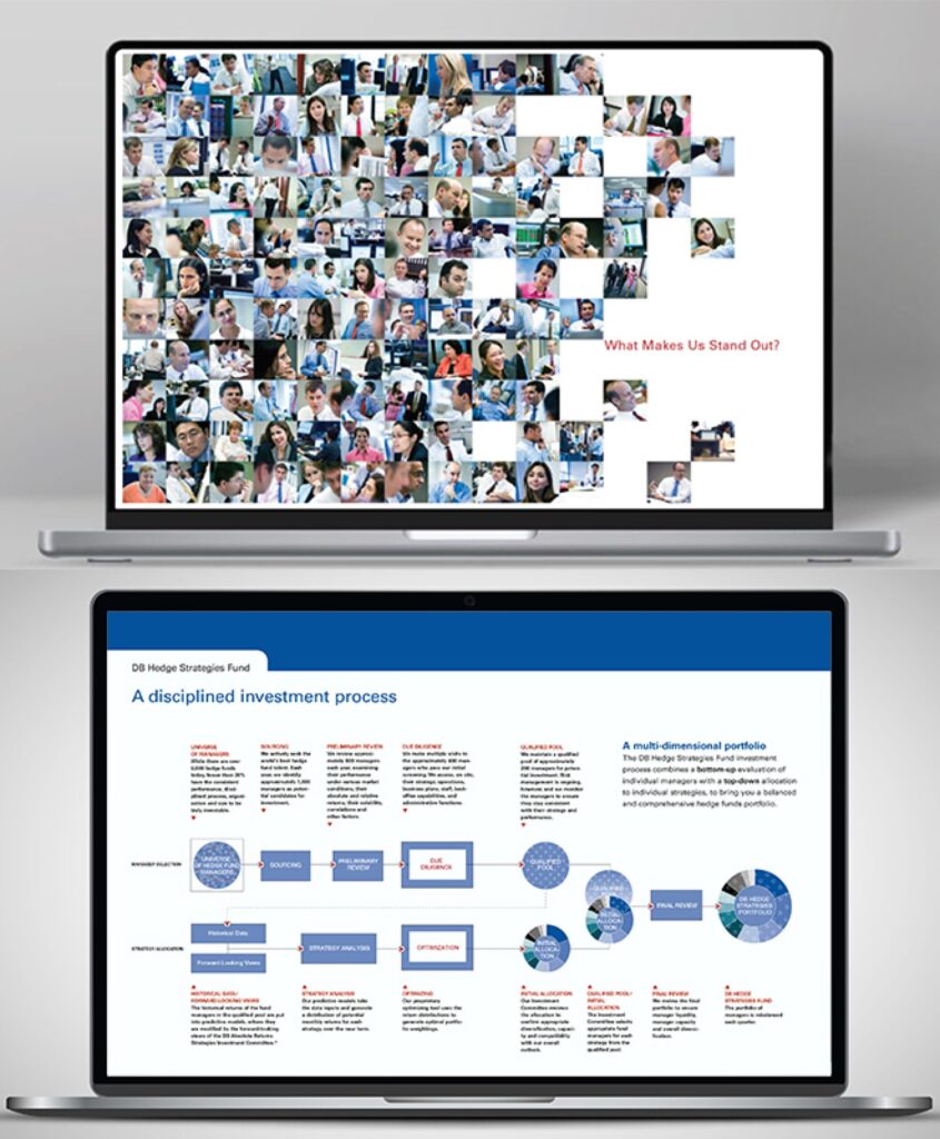 Our branding program for Deutsche Bank’s $6.5 billion fiduciary hedge funds group included a website, brochures, advertising, and a Hedge Funds Primer for new investors and brokers.