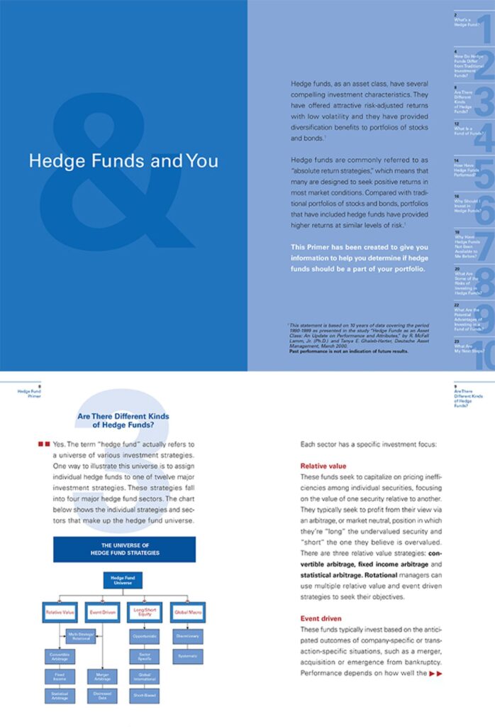 The Wynbrandt Company developed the branding program for Deutsche Bank’s fiduciary hedge funds group. I created all marketing materials, which ranged from brochures and pitchbooks to ads, a website, and a “Hedge Funds Primer” for new investors and their brokers.